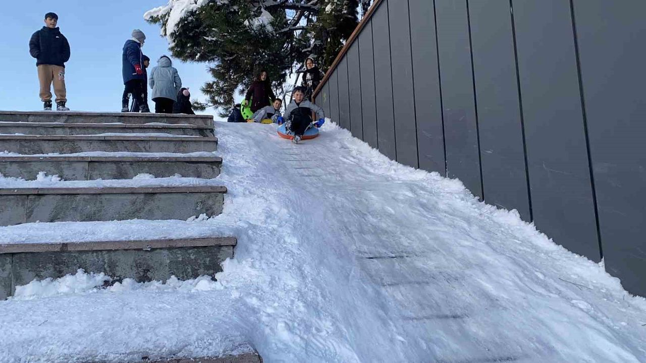 Bolu'da Kent Meydanı'nda merdivenleri kayak pistine çeviren çocuklar, şambrellerle kayarak doyasıya eğlendi.