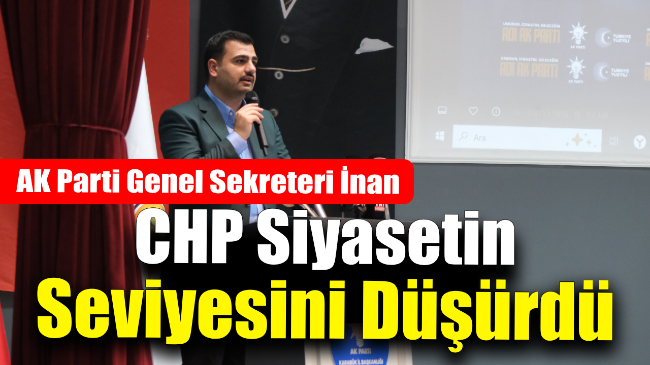 AK Parti Genel Sekreteri Eyyüp Kadir İnan, CHP’nin son dönemde kullandığı dilin Türk siyasetinin seviyesini düşürdüğünü belirterek, "Bir zamanlar siyasetin bir asaleti vardı. Bugün CHP’nin genel başkanından yardımcılarına kadar her gün biraz daha düşen bir seviye izliyoruz" dedi.