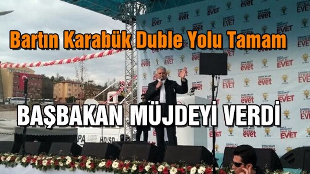 Başbakan Binali Yıldırım'ın geçtiğimiz günlerde son anda ertelenen Bartın mitinginde beklenen müjde bugün geldi. Yıldırım konuşmasında Karabük Bartın yolu duble yol olacak hayırlı olsun diyerek müjdeyi verdi.