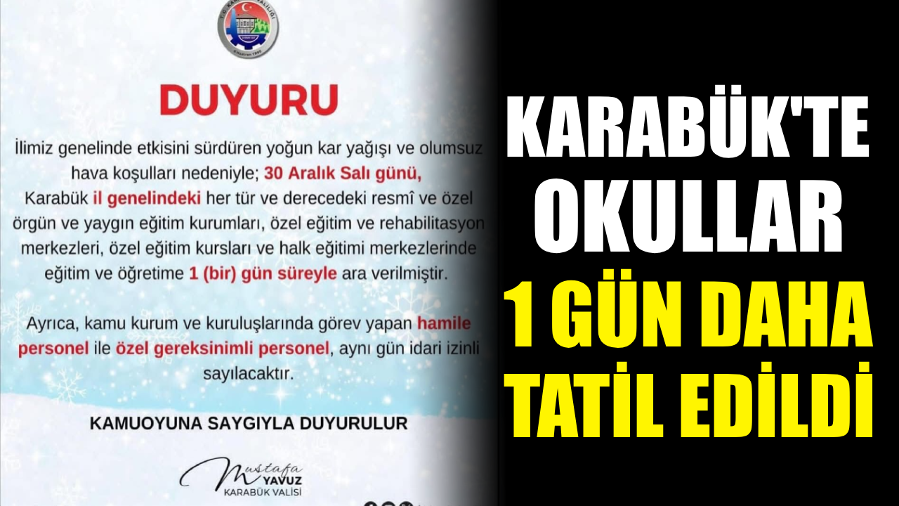 Karabük’te etkisini artıran yoğun kar yağışı ve olumsuz hava koşulları nedeniyle eğitime ara verildi. Karabük Valiliği tarafından yapılan açıklamada, 30 Aralık Salı günü il genelindeki tüm resmî ve özel eğitim kurumlarında eğitim ve öğretime 1 gün süreyle ara verildiği duyuruldu.