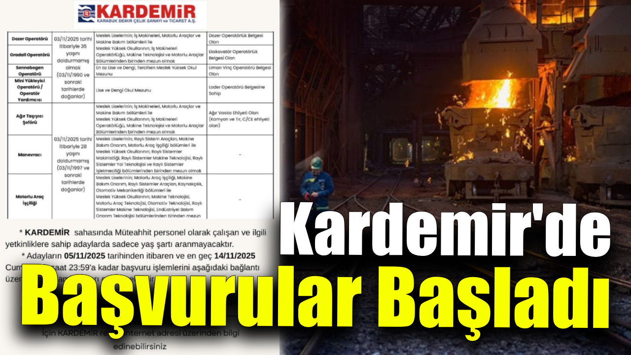 KARDEMİR Demir Çelik Sanayi ve Ticaret A.Ş., farklı alanlarda personel alımı yapacağını açıklayarak başvuruların 5 Kasım 2025 tarihinde başladığını duyurdu. Başvurular, 14 Kasım 2025 tarihine kadar kardemir.com.tr