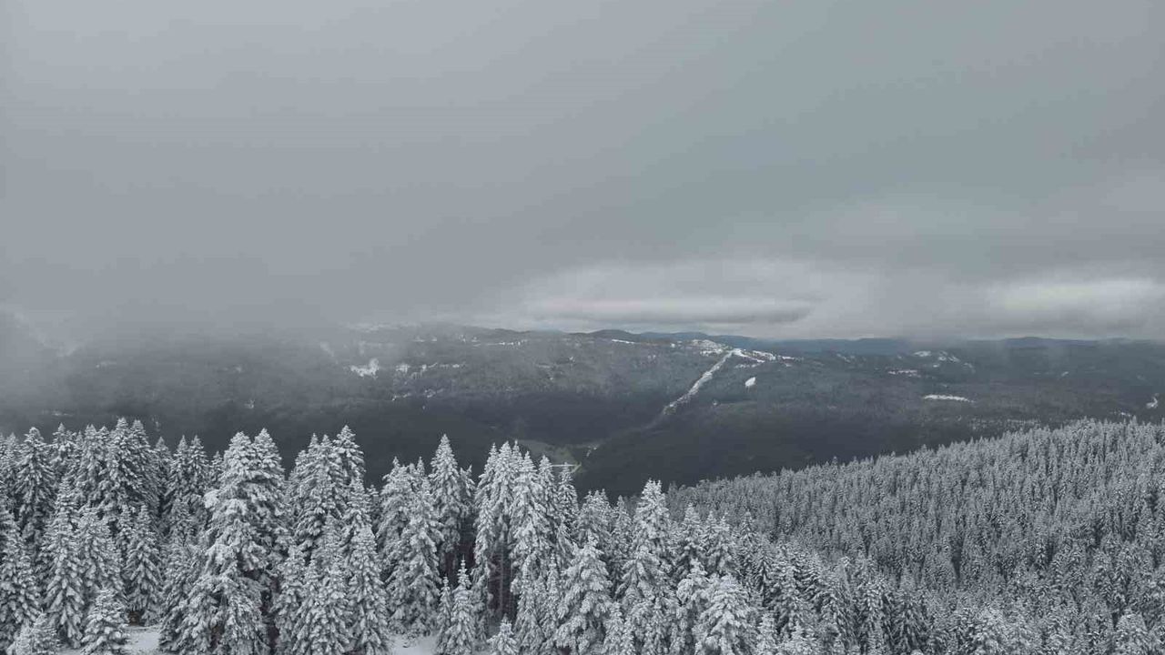 Kar yağışıyla beyaza bürünen Ilgaz Dağı, havadan görüntülendi.