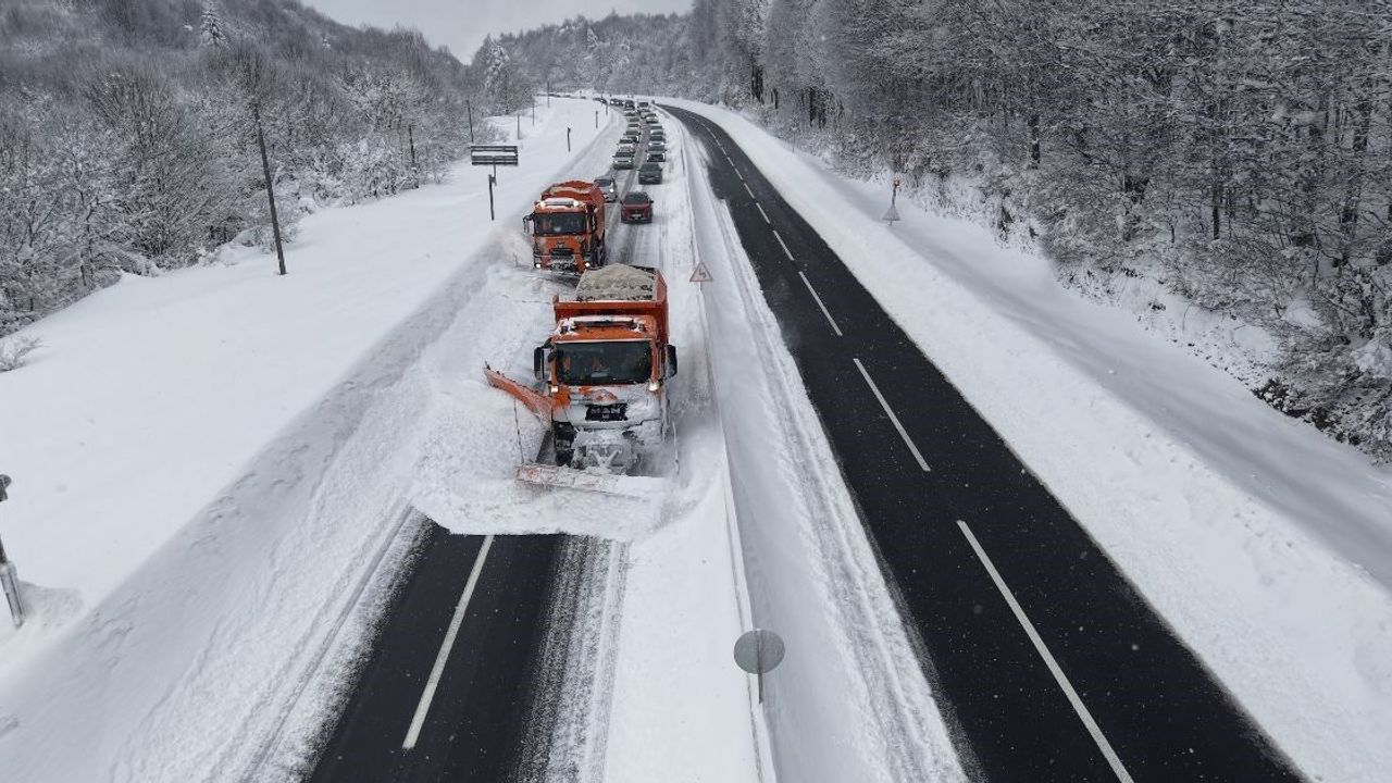İstanbul ile Ankara arasında ulaşımın kilit noktası olan D-100 karayolunun Bolu Dağı geçişinde kış şartları ağırlaşırken, Karayolları ekipleri de 7 gün 24 saat esasına göre çalışmalarını sürdürüyor. Yoğun kar yağışıyla birlikte harekete geçen ve bölgede 'Kar kaplanları' olarak bilinen Karayolları ekipleri, güzergahın ulaşıma kapanmaması için yoğun çaba sarf etti. Kar küreme ve tuzlama araçlarıyla yolda biriken karları temizleyen ekipler, sürücülerin güvenli seyahat etmesini sağladı. Ekiplerin, karla kaplı virajlı dağ yollarını temizleyerek siyah asfalta dönüştürdüğü o anlar dron ile havadan görüntülendi. Görüntülerde, kar kaplanlarının beyaz örtü arasındaki zorlu mücadelesi ve açılan yolların manzarası yer aldı.