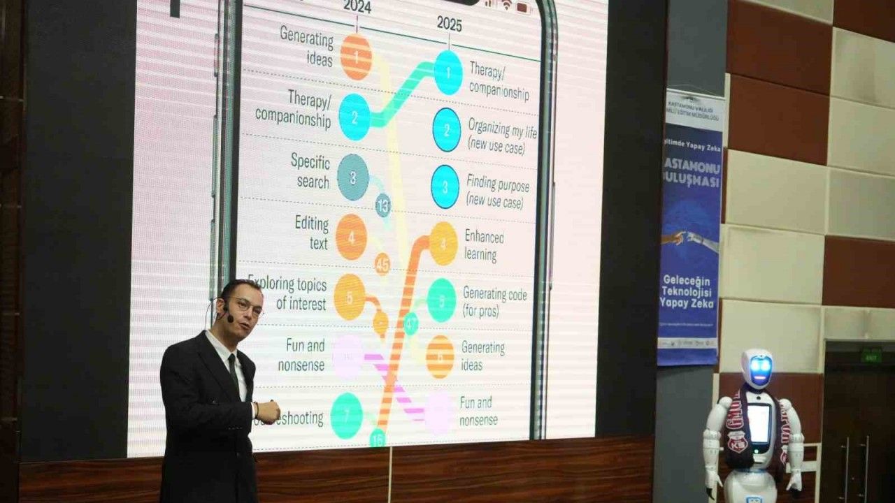 Programda konuşan Kastamonu İl Milli Eğitim Müdürü Hasan Gümüş, "Dünya hızlı bir şekilde teknolojik bir değişim ve dönüşüm süreci içerisindedir. Bu değişim ve dönüşümü etkileyen en önemli unsurlardan biri de yapay zeka sistemidir. Nasıl ki endüstri devrimiyle beraber toplumlar ve bireyler büyük bir değişim yaşadıysa, yapay zeka ile birlikte de toplumların ve bireylerin değişimi kaçınılmaz hale gelmiştir. Bu kadar hızlı bir değişimin içerisinde, geleceği inşa edecek öğrencilerimizin ve öğretmenlerimizin yapay zekanın sunduğu imkanlardan yararlanmasını gözardı etmemiz mümkün değildir. Bu nedenle sizleri bu ve benzeri eğitimlerle buluşturma gayreti içerisindeyiz. Günümüzde artık sadece bilgiye erişmek bir anlam taşımamaktadır. Aynı şekilde yapay zeka ve teknolojik gelişmelerin farkında olmak da tek başına yeterli değildir. Önemli olan, bilgiyi işleyip üretime dönüştürebilmek ve ortaya değerli ürünler çıkarabilmektir. Ülkemizin Türkiye Yüzyılı vizyonu çerçevesinde büyük hedefleri bulunmaktadır. Bu hedeflere ulaşırken insanı merkeze alan, teknolojik gelişmeleri de eş güdümlü şekilde sürdürebilen bir anlayışa sahip olmamız gerekmektedir" dedi.