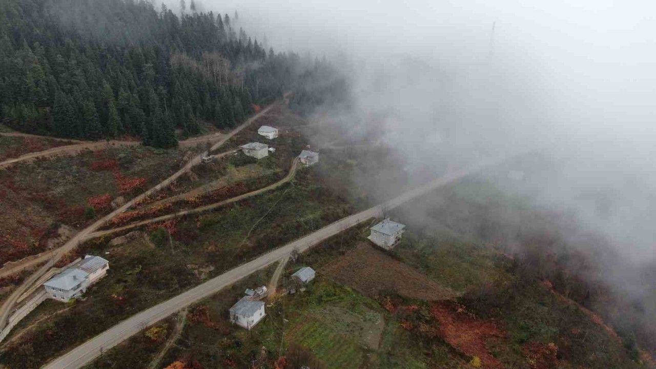 Sis nedeniyle sürücülerin zor anlar yaşadığı Yaralıgöz Dağı’nın sisle sunduğu manzara, dron ile görüntülendi.