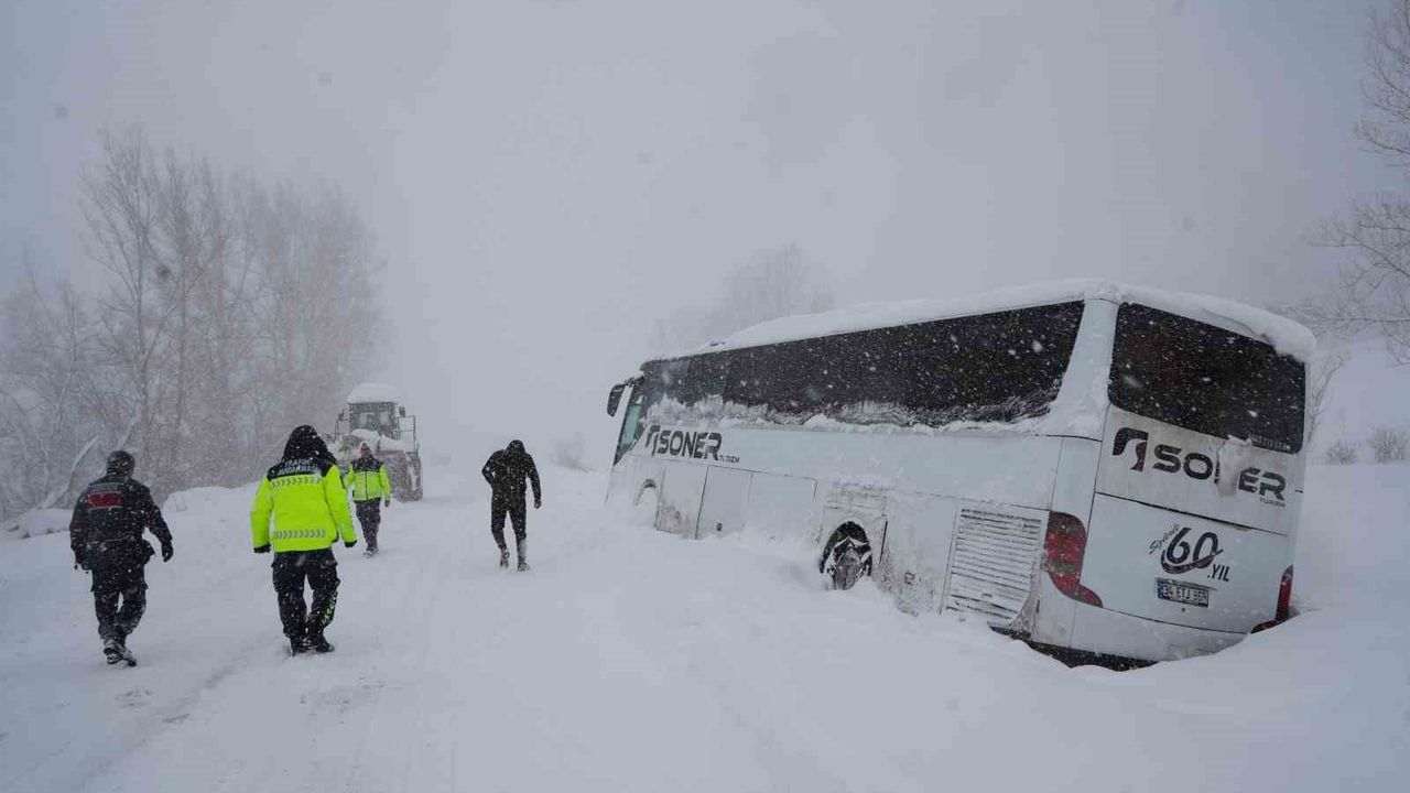 Kastamonu-Araç karayolunda kar ve tipi sebebiyle yoldan çıkarak kara saplandı. Karda mahsur kalan yolcu otobüsündeki yolcular ise bölgeye sevk edilen başka bir araç ile tahliye edildi. Yolcu otobüsü vinç yardımıyla çekilerek kurtarıldı. Kurtarma çalışması sırasında kapanan yolda uzun araç kuyruğu oluştu.