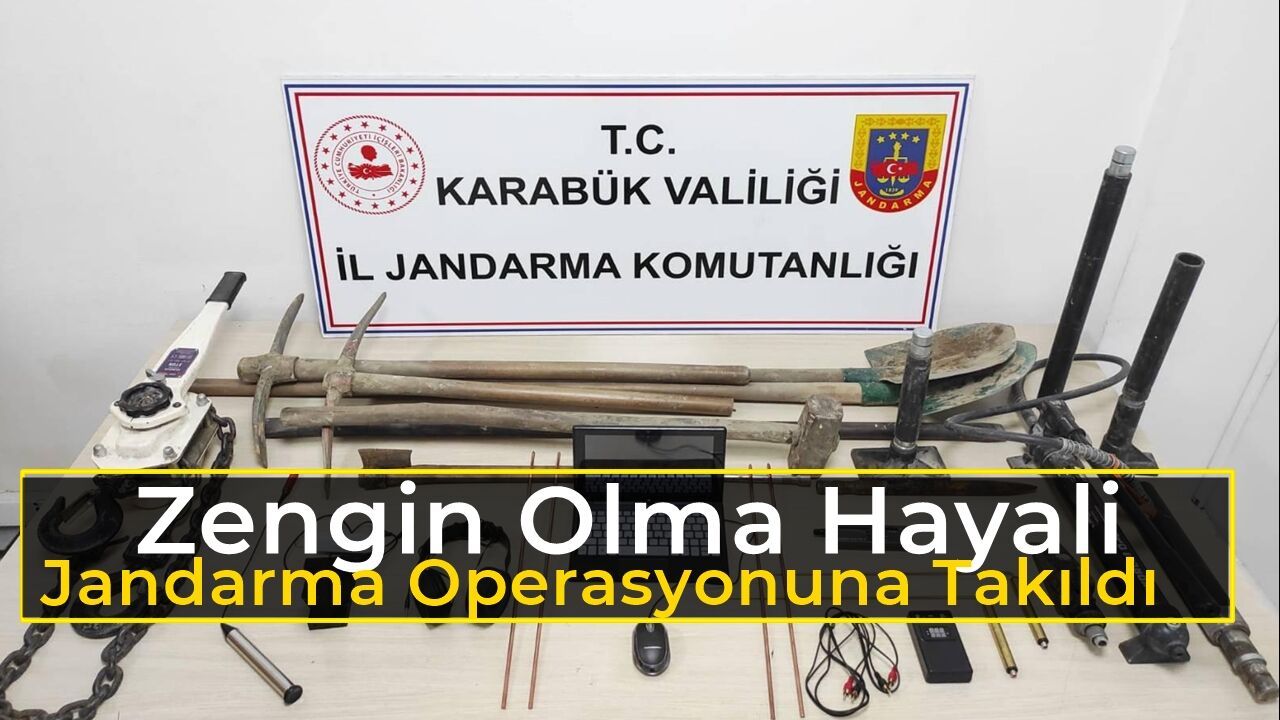 "Karabük Cumhuriyet Başsavcılığı koordinesinde, Karabük İl Jandarma Komutanlığı unsurlarınca, 27 Mart 2026 tarihinde Karabük Merkez’de icra edilen faaliyet esnasında izinsiz kazı yapan (3) şahıs (1) adet hidrolik doğrultma seti, (1) adet calaska, (1) adet dizüstü bilgisayar, (1) adet kulaklık, (2) adet alan tarama cihazı, (1) adet kıymetli taş ölçüm cihazı, (1) çift define arama çubuğu, (4) adet bakır çubuk, (9) adet muhtelif kazı malzemesi birlikte suçüstü yakalanmıştır. Şüpheliler yapılan işlemlerin ardından adli makamlara sevk edilmiştir.