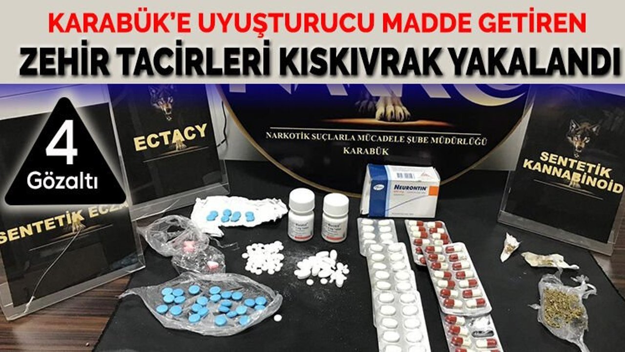 Karabük Narkotik Suçlarla Mücadele Şube Müdürlüğü ekipleri tarafından çalışmalar yapıldı. Neticede kente uyuşturucu getireceği bilgisi alınan 2’si kadın olmak üzere 4 kişi gözaltına alındı. Edinilen bilgiye göre, Narkotik Suçlarla Mücadele Şube Müdürlüğü ekipleri H. G.(57) isimli şahsın İstanbul ilinden Karabük’e uyuşturucu madde getireceği bilgisinin alınması üzerine çalışma başlattı. Eskipazar ilçe girişinde aracının durdurulduğu şahıs yanında bulunan Ü.G., İ.G. ve Y. B. ile birlikte gözaltına alındı. Ekiplerin araçta ve şahısların üzerinde yaptığı aramada 1.76 gram kadar sentetik kannobinoid maddesi. 35 adet ectasy hap, reçeteye tâbi 80 adet Rivotril tablet, 51 adet Neurotin tablet. Ve 36 adet Lyrca tablet (sentetik ecza) ele geçirildi. Uyuşturucu madde temin ve ticareti suçundan gözaltına alınan şüpheliler emniyetteki işlemlerinin ardından sağlık kontrolünden geçirilerek adliyeye sevk edildi.