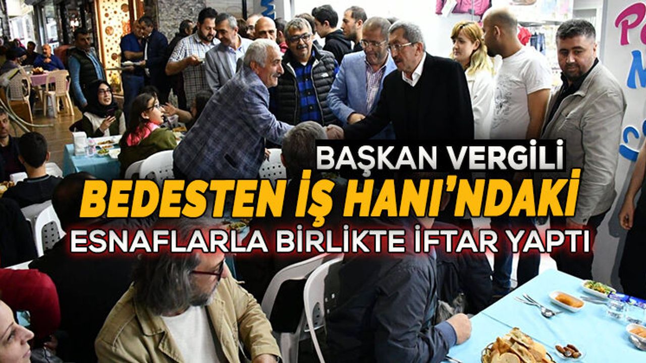 Bedesten İş Hanı’ndaki esnaflar tarafından düzenlenen iftar yemeğine katılan Başkan Vergili, masaları tek tek ziyaret etti. Vergili, vatandaşlarla sohbet ederek; ramazan ayını kutlayıp, sağlık ve sıhhat içinde bayrama kavuşmalarını diledi.